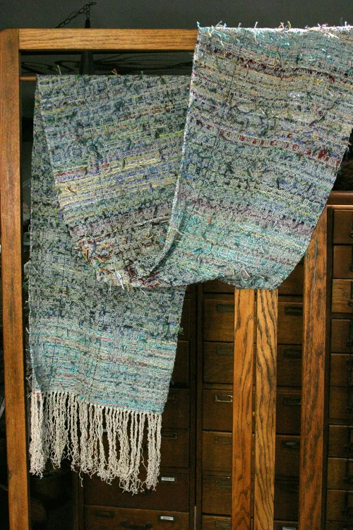 Fine tercel and turquoise beads on a ruffled edge scarf seemed right when I wove all night while I was watching the stars. Only 12” x 32” for $225.