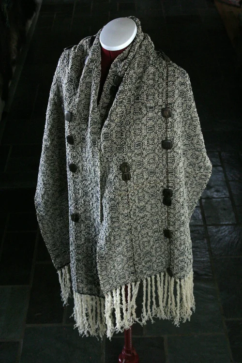Look closely and you will see incredible detail and texture in travertine terraces which inspired this silk boucle weaving embellished with wooden beads. Feel special wearing it indoors or out, wrapped atop a dress, or draped softly around your shoulders.