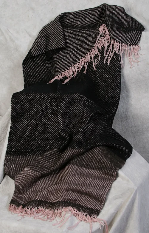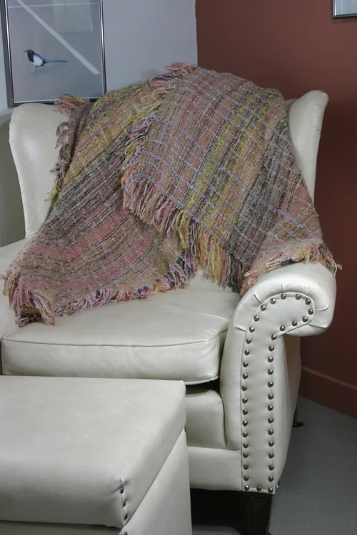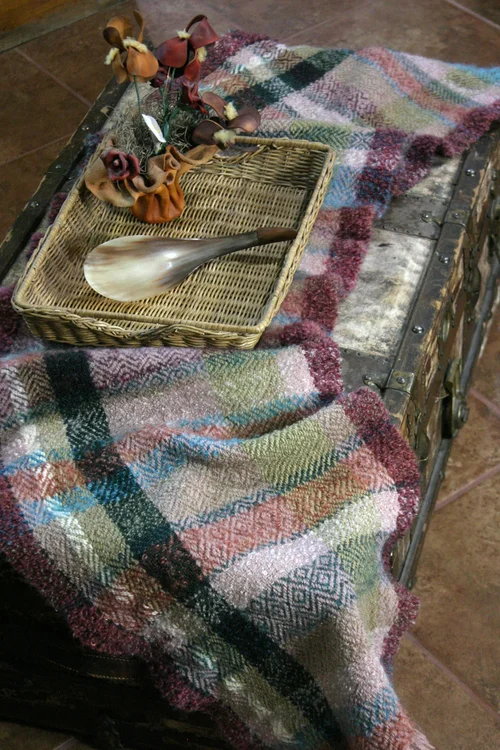 This is a cuddly throw woven of hand-dyed wool, alpaca, mohair, and silk boucle. Size is 28" x 60" for $790.