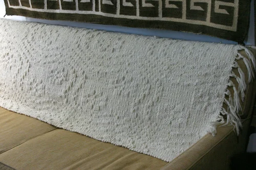The wall hanging can double as a shawl. It is based on a colonial pattern with added wooden beads at the fringe. Size is 17.5" x 112" for $1,200.